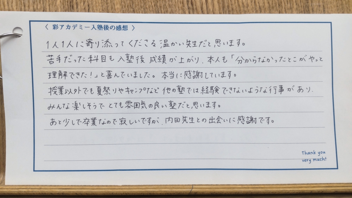 保護者様より入塾後の感想を頂戴しました!校門前でお渡ししたチラシから、ご縁がつながりましたこと、大変ありがたく存じます。...