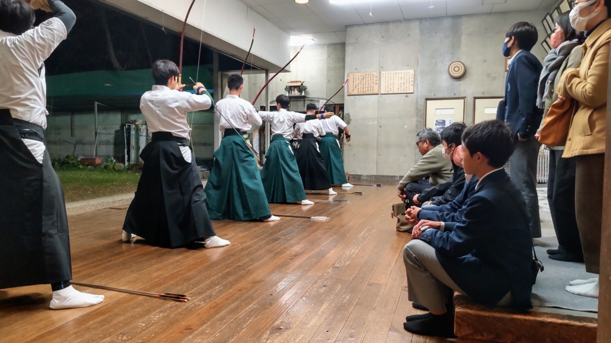 緊張感のあるなか、弓の音が甲高く鳴り響き、的にあたると男子が太い声でたたえ合う。かっこいいに尽きる時間でした。
