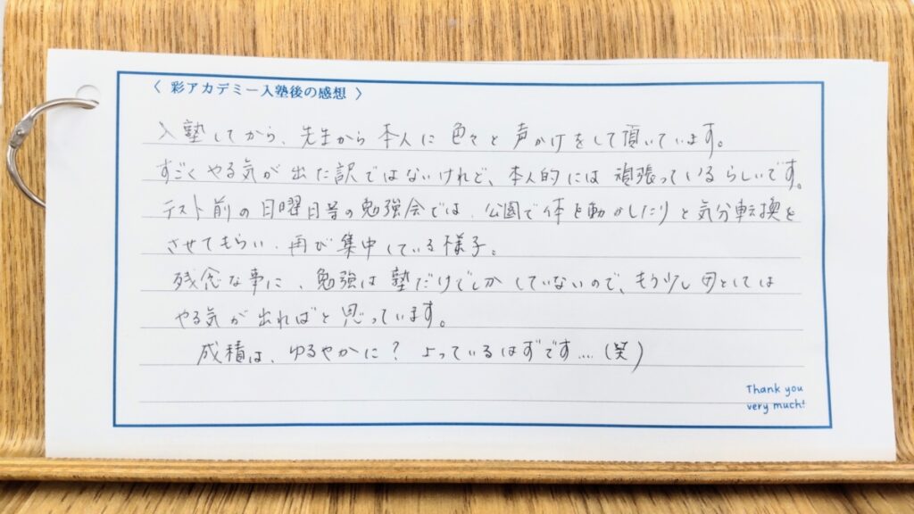 入塾してから、先生から本人に色々と声かけをして頂いています。